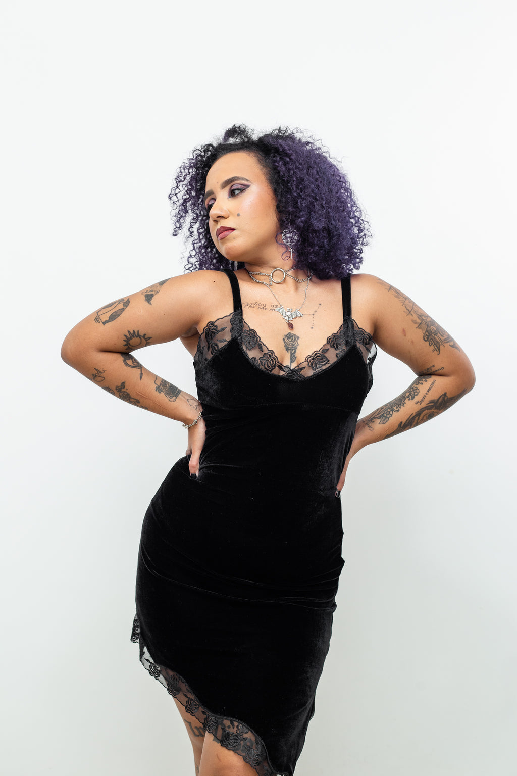 O vestido Aura Profana tem uma presença poderosa, é como se ele já viesse com um ar de mistério, realeza sombria e poesia, Ideal para quem quer parecer uma figura perdida no tempo e adora aqueles cenários como catedrais com colunas altíssimas e arquitetura gótica, bibliotecas rodeada de livros empoeirados e madeira escura ou até mesmo uma casa de ópera com escadarias e cortinas vermelhas.