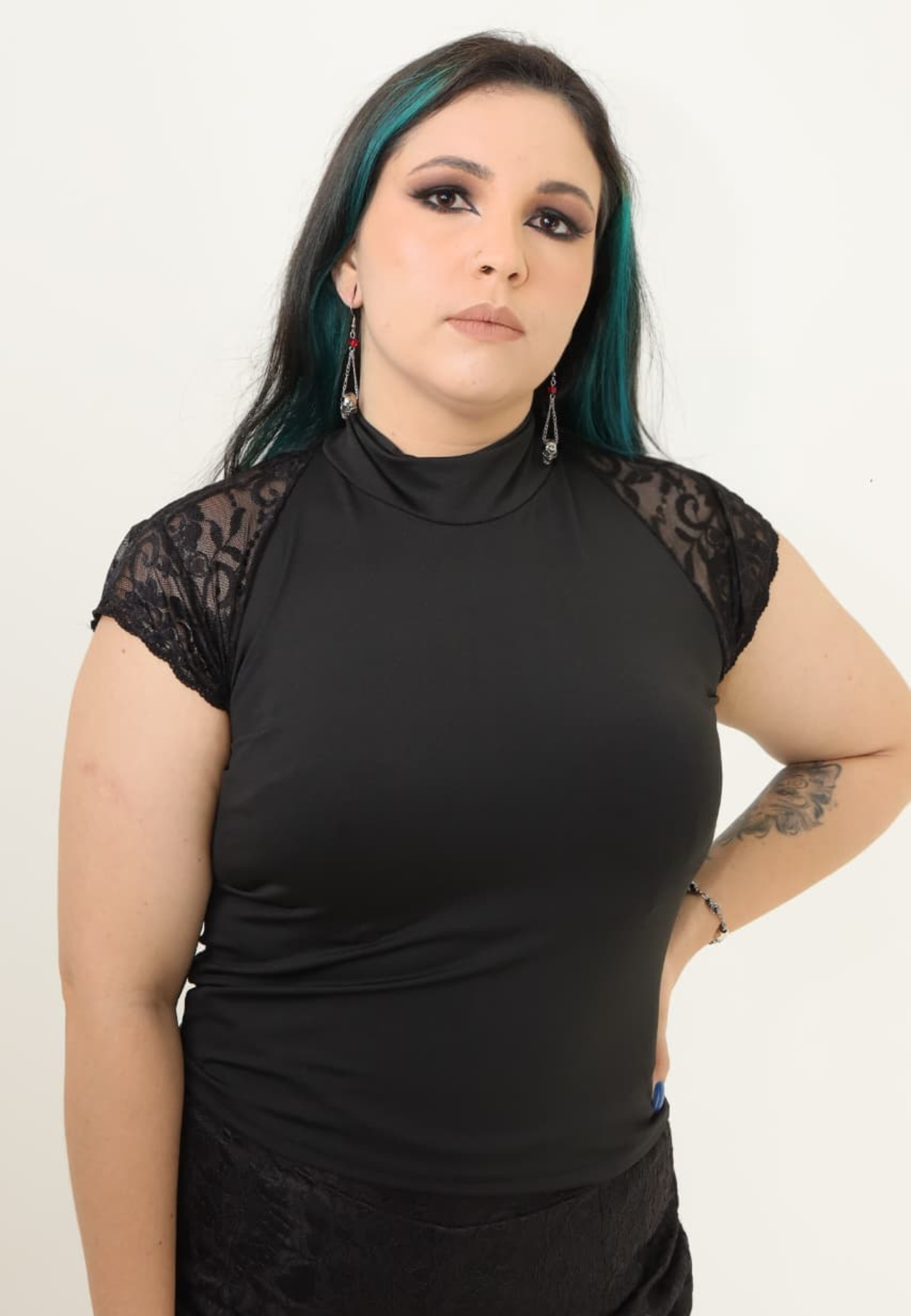 Blusa confeccionada em suplex com detalhe em renda na manga