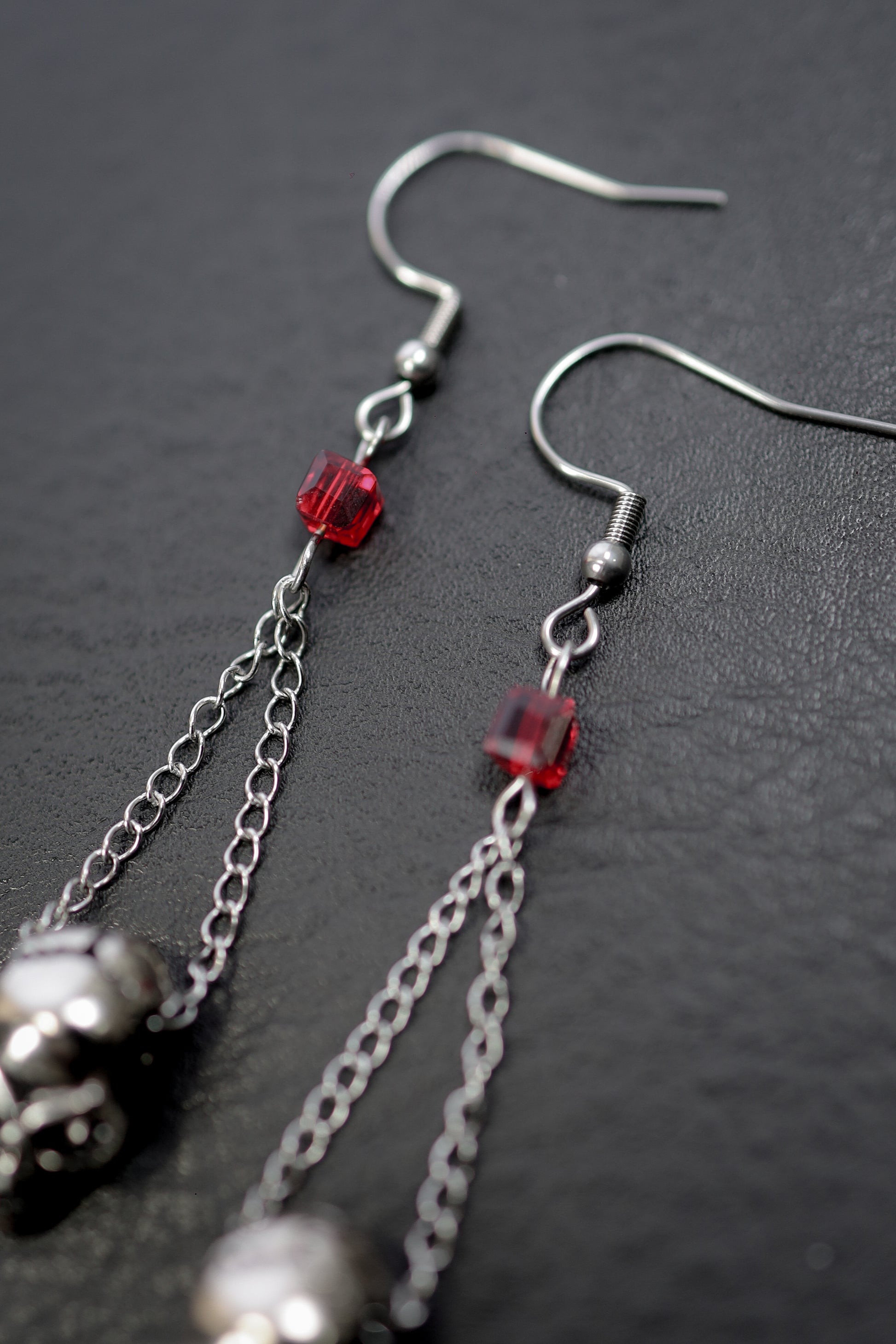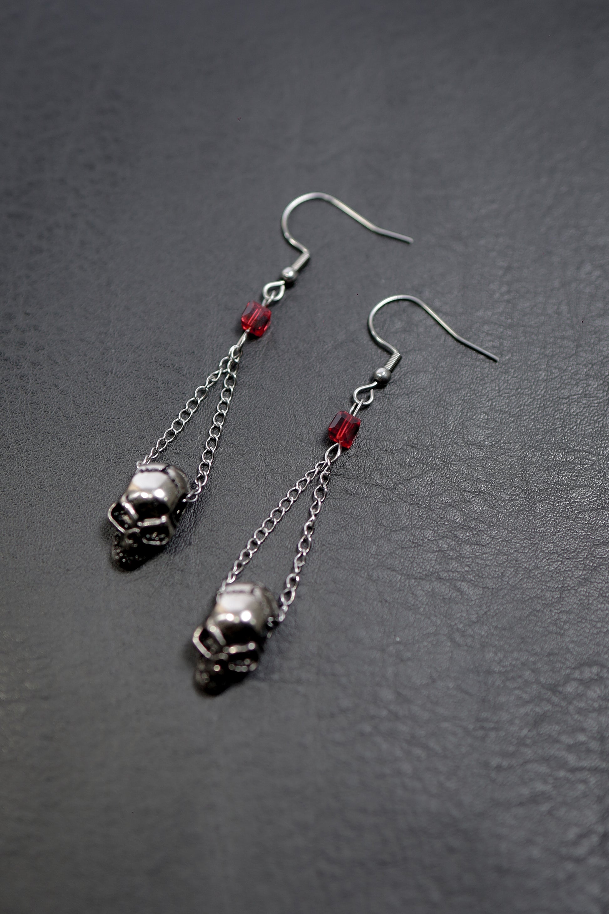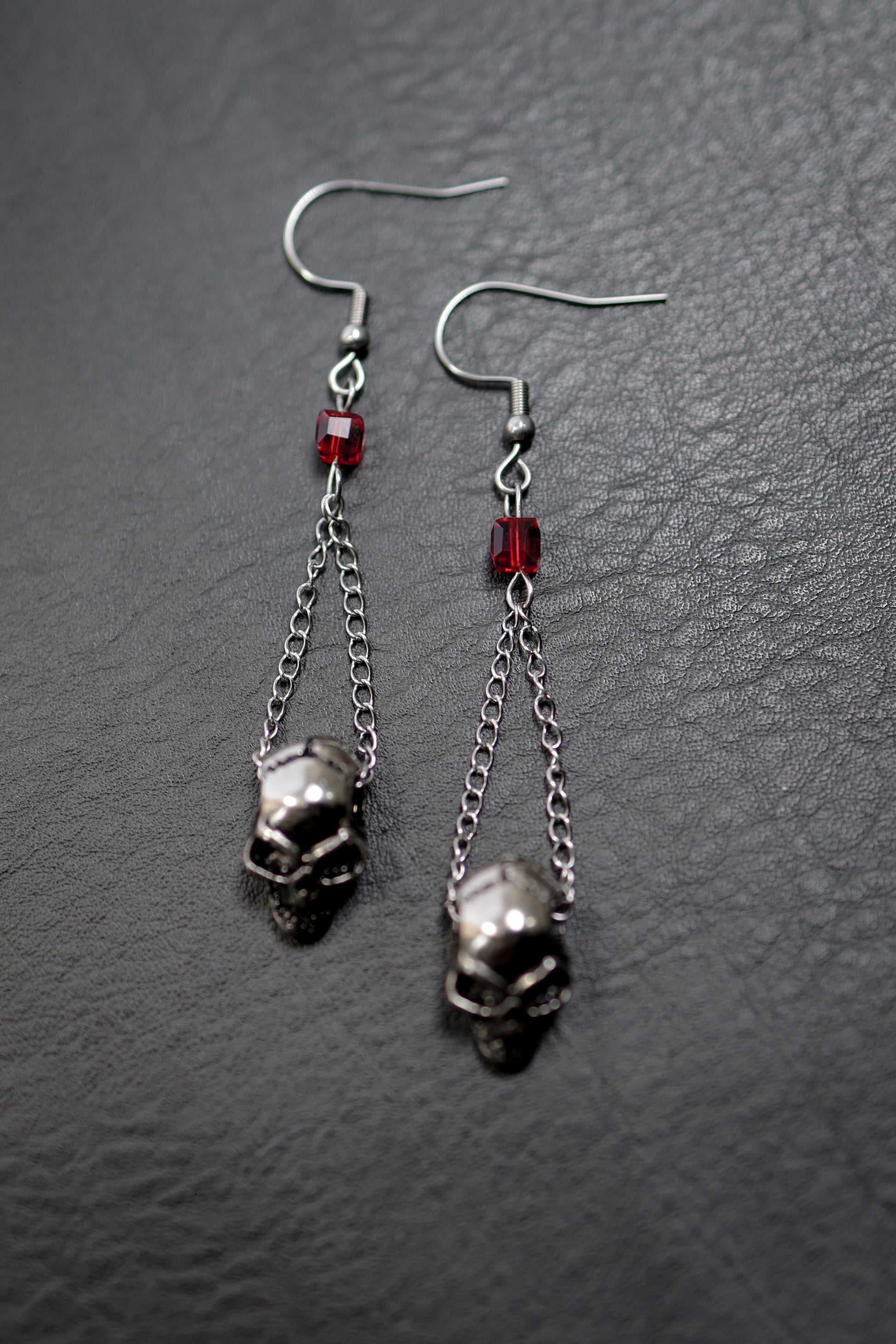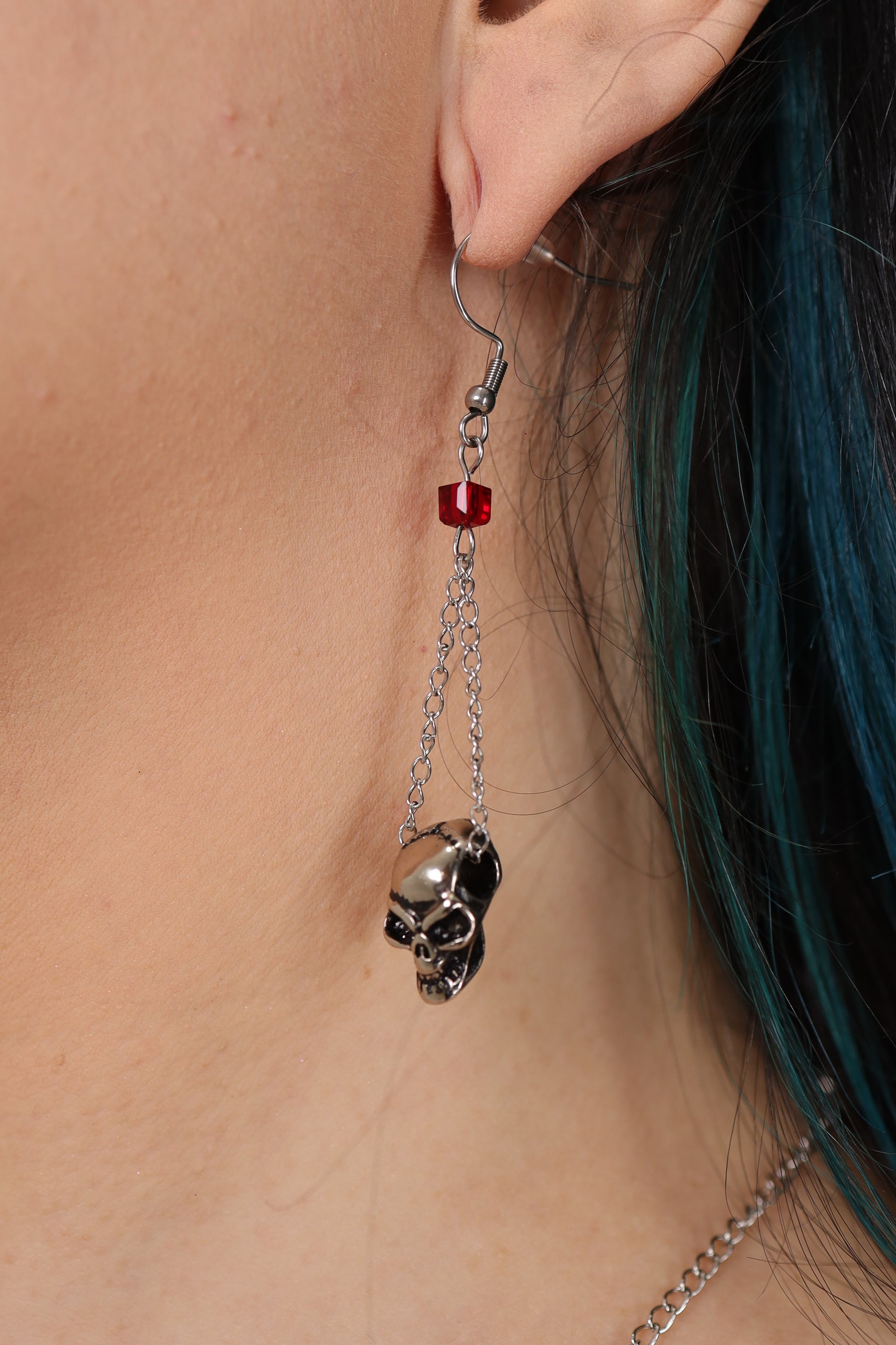 Brinco com pingente de crânio em metal e cristal quadrado vermelho